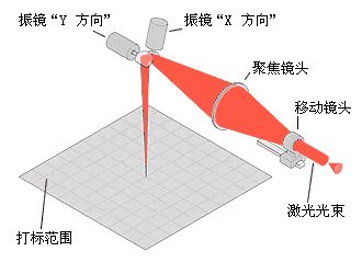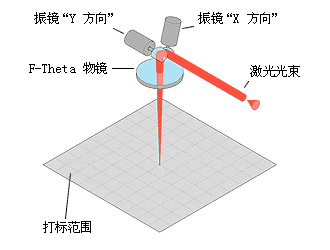 振鏡掃描式打標頭主要由XY掃描鏡、場鏡、振鏡及計算機控制的打標軟件等構(gòu)成。根據(jù)激光波長的不同選用相應(yīng)的光學元器件。相關(guān)的選件還包括激光擴束鏡、激光器等。其工作原理是將激光束入射到兩反射鏡(掃描鏡)上,用計算機控制反射鏡的反射角度,這兩個反射鏡可分別沿X、Y軸掃描,從而達到激光束的偏轉(zhuǎn),使具有一定功率密度的激光聚焦點在打標材料上按所需的要求運動,從而在材料表面上留下永久的標記,聚焦的光斑可以是圓形或矩形,其原理如右圖所示。在振鏡掃描系統(tǒng)中,可以采用矢量圖形及文字,這種方法采用了計算機中圖形軟件對圖形的處理方式,具有作圖效率高,圖形精度好,無失真等特點,極大的提高了激光打標的質(zhì)量和速度。同時振鏡式打標也可采用點陣式打標方式,采用這種方式對于在線打標很適用,根據(jù)不同速度的生產(chǎn)線可以采用一個掃描振鏡或兩個掃描振鏡,與前面所述的陣列式打標相比,可以標記更多的點陣信息,對于標記漢字字符具有更大的優(yōu)勢。