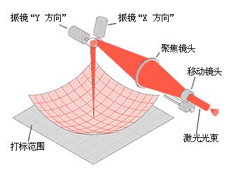 在前聚焦掃描振鏡工作時,激光束首先進入移動鏡頭。通過移動鏡頭之后,光束快速分散,接著進入一個或兩個聚焦鏡頭。會聚的光束穿過鏡頭,并由一組 X 和 Y 鏡片(這些鏡片由振鏡式掃描器移動)引導。X 和 Y 鏡片呈直角排列,向下引導光束,覆蓋工作范圍的長和寬。
