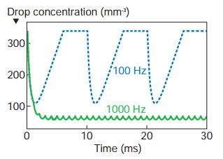 圖1:計(jì)算機(jī)模擬顯示,在100~1000Hz的重復(fù)頻率下,由皮秒激光脈沖產(chǎn)生的沖擊波,可以清除氣缸內(nèi)濃度隨時(shí)間變化的水滴。注意,較高的重復(fù)頻率可使路徑上無液滴。