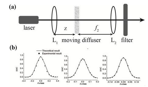 相干度大小腔外調(diào)控最常用的方法是通過動態(tài)散射體(例如旋轉(zhuǎn)的毛玻璃、動態(tài)液晶光調(diào)制器等)降低激光束的相干度大小,如圖4(a)所示,一束激光經(jīng)過透鏡L1聚焦后照射到動態(tài)散射體,從動態(tài)散射體出來的光束可以近似為非相干光束,經(jīng)透鏡L2以及濾波器組成的傅里葉變換系統(tǒng)之后,便可產(chǎn)生高斯謝爾模(GSM)光束(典型的部分相干激光束),通過控制透鏡L1到動態(tài)散射體直接的距離z來控制動態(tài)散射體上的聚焦光斑大小,當(dāng)聚焦光斑越大,得到的GSM光束的相干度越小。