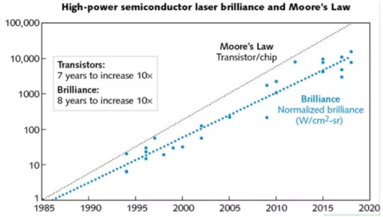 圖1:高功率半導(dǎo)體激光器的亮度和摩爾定律的比較