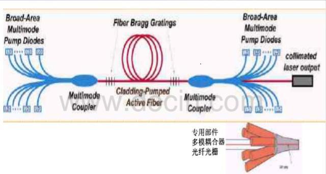 我們簡單看一下光纖激光器的原理和構(gòu)造,它是由泵浦源、多模耦合器 (合束器)、光纖光柵、有源光纖、光束校準(zhǔn)輸出模塊以及無源光纖(能量輸出光纖)等組成。當(dāng)激光器內(nèi)部只有一個泵浦模塊時,就稱之為單模激光器,而多個泵浦模塊組合在一起,通過合束器讓多束泵浦光進入有源光纖中,這樣可以得到更高功率的光束,這種多模塊組合的激光器就是多模激光器。因而,主流的光纖激光器產(chǎn)品中,單模激光器大都為中小功率,而高功率產(chǎn)品則多是多模激光器。