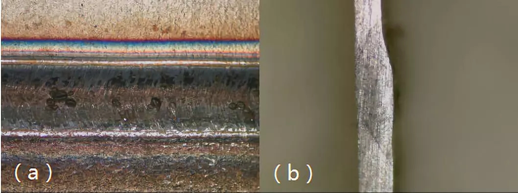 圖3 (a)內膽底焊縫正面(b)內膽底焊縫橫截面
